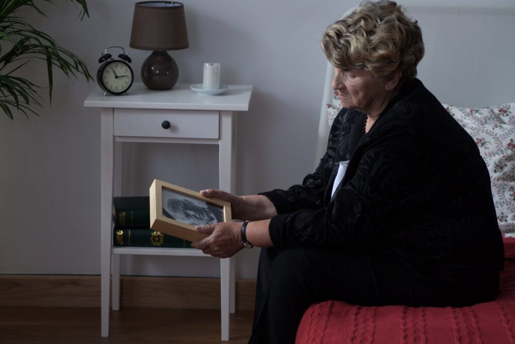 Žena je smutná, protože jí zemřel manžel.