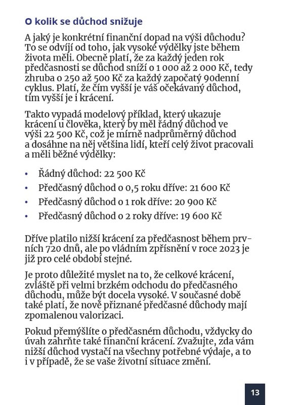 Praktický návod, ve kterém se dozvíte vše důležité o předčasném důchodu. Obsahuje praktické rady týkající se finančního krácení i načasování, abyste se mohli co nejlépe rozhodnout, jestli se vám vyplatí odejít dříve do důchodu.
